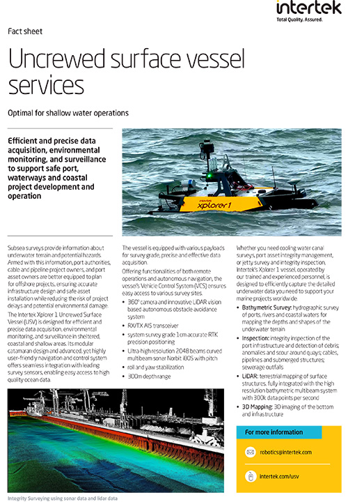 Whether you need cooling water canal surveys, port asset integrity management, or jetty survey and integrity inspection, Intertek’s Xplorer 1 vessel, operated by our trained and experienced personnel, is designed to efficiently capture the detailed underwater data you need to support your marine projects worldwide.
